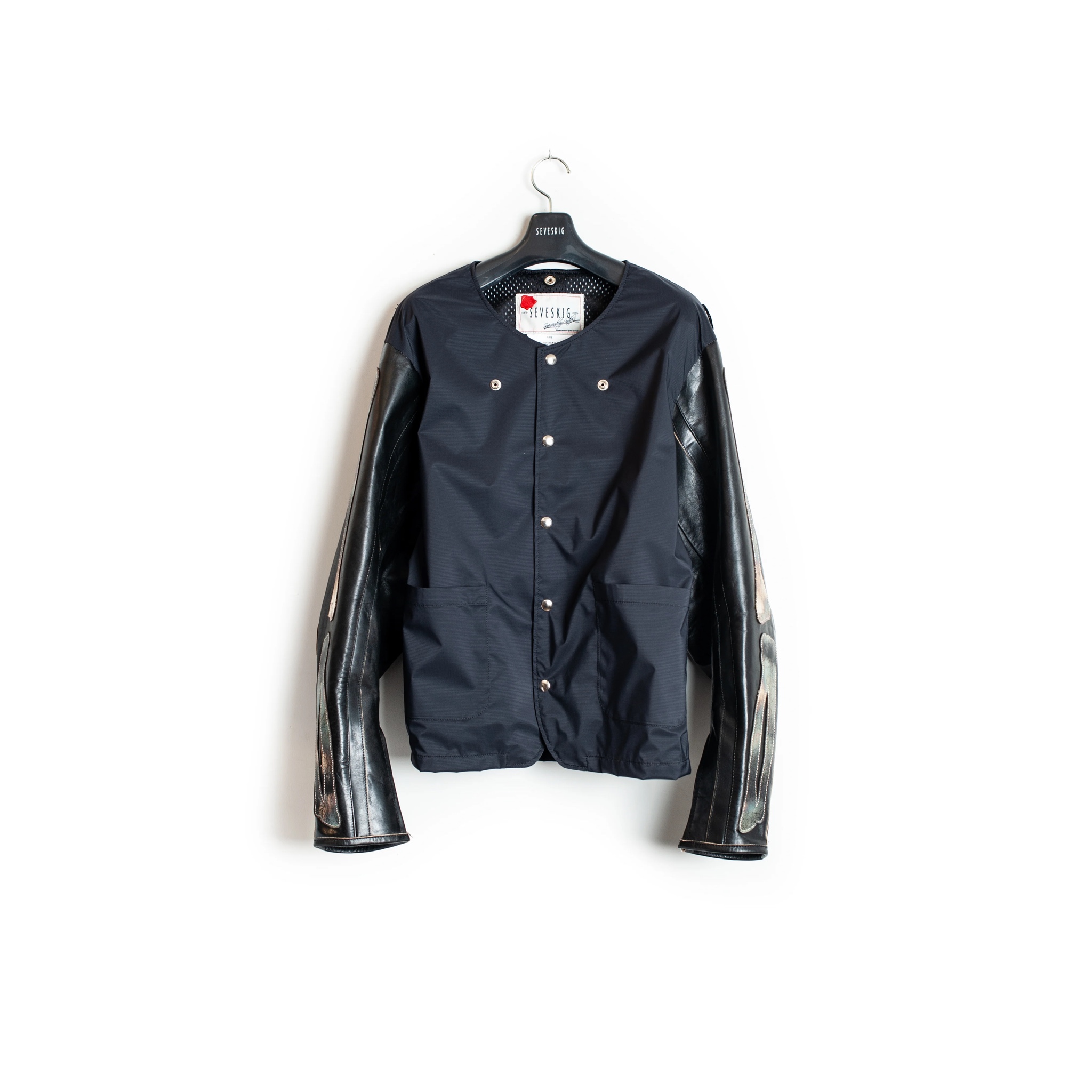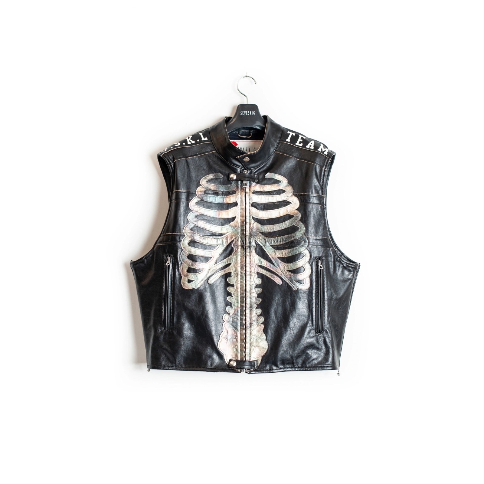 SEVESKIGを象徴する“骨”をモチーフを、京都、伊根で加工した本銀箔で全面にあしらったレーシングジャケット。日本産ホルスタイン原皮をベースに、茶芯仕上げのオリジナルレザーを使用しています。