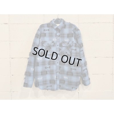 1980年代のL●VI'Sプリントハンティングネルシャツから着想を得た、太番手強撚糸ウールネルシャツ。日本で狩猟される動物と、その動物を狩るハンターをカットジャガードで立体的に表現しています。VINTAGEのLONG HORNEウエスタンシャツを彷彿とさせる、シャリ感と艶感が特徴。カットジャガードにリフレクター糸を折り込み、動物が光るギミックになっています。