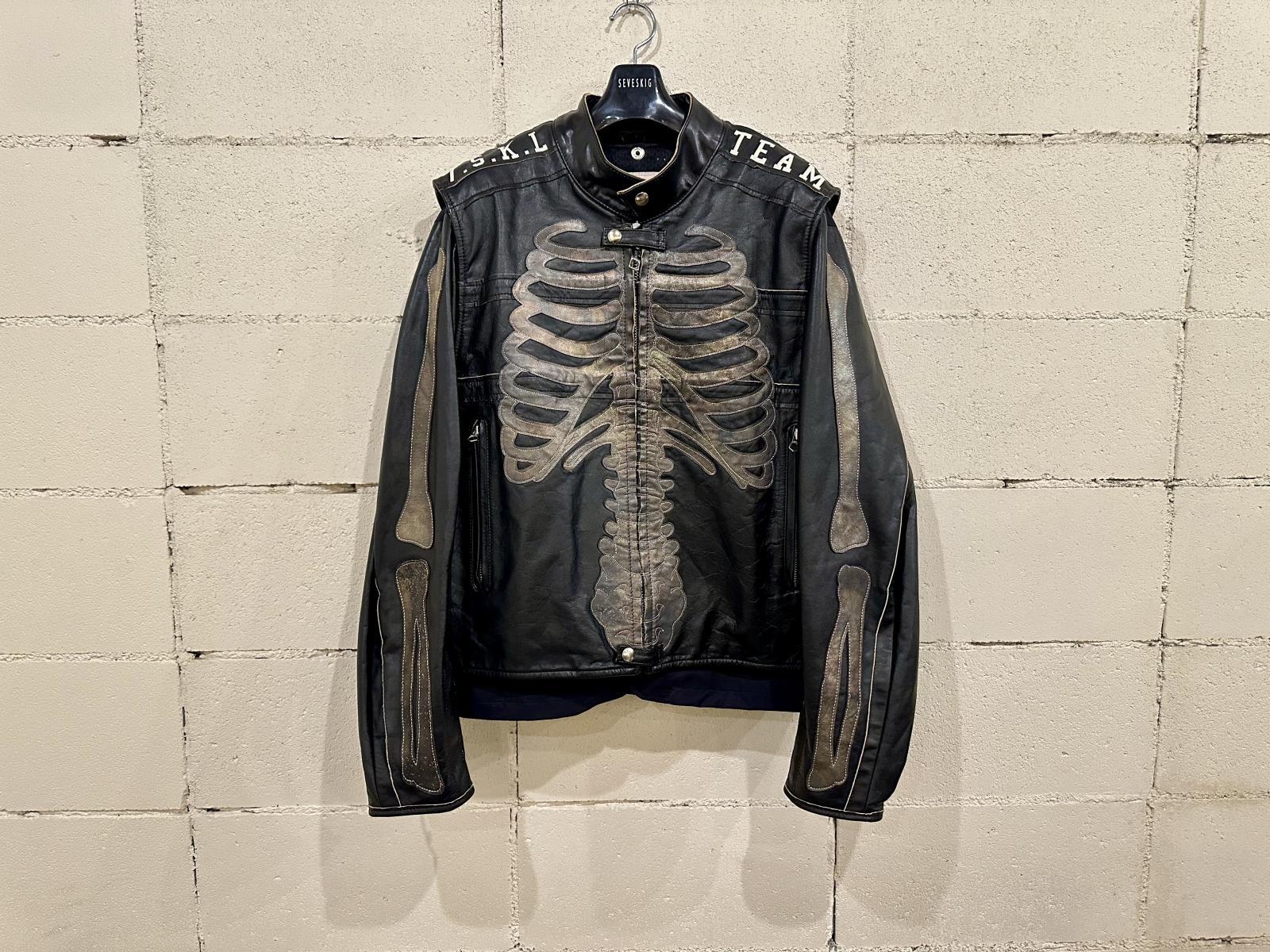SEVESKIGを象徴する“骨”をモチーフを、京都、伊根で加工した本銀箔で全面にあしらったレーシングジャケット。日本産ホルスタイン原皮をベースに、茶芯仕上げのオリジナルレザーを使用しています。